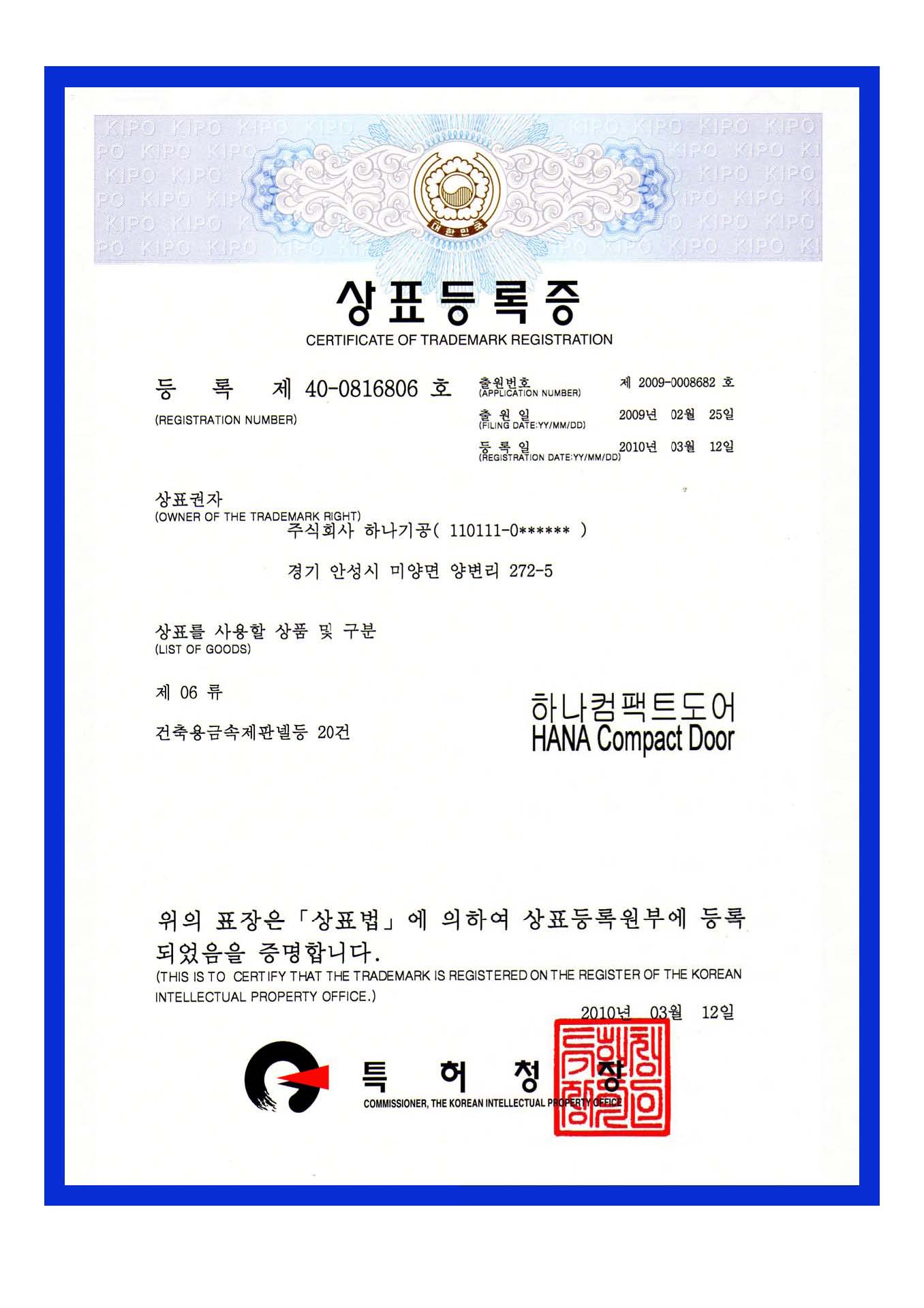 상표등록) 하나컴팩트도어